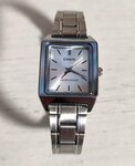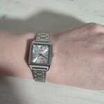 Двадцать лет назад подарил жене часики фирмы Casio и они честно отработали весь обещанный срок. Разве что раза три меняли ремешок. Поэтому в этот раз без колебаний выбрал ту же фирму, только вместо ремешка браслет. Заказ пришёл вовремя и быстро, со всеми документиками. Минут за десять легко удалил 4 звена из браслета (по два с каждой стороны от застежки для симметрии) с помощью обычного шила. В Интернете есть куча видео об этой процедуре. Лишние звенья сохранил, чтобы при необходимости добавить. Часы предлагаются в различных цветовых вариантах циферблатов и стрелок. Выбрал светлый циферблат и черные стрелки - так виднее и не надо будет подносить руку к лицу. За две недели часы сохранили точность хода до секунды, для этой фирмы это обычное дело в течение года. Жена носит часики не только на работе, но и дома в выходные дни! Так бывает, когда вещь нравится. Тем более, что от брызг или дождя они надежно защищены. Под стальной браслет подходят сережки и кольца из серебра, не придется потом дарить золото (сэкономил!).