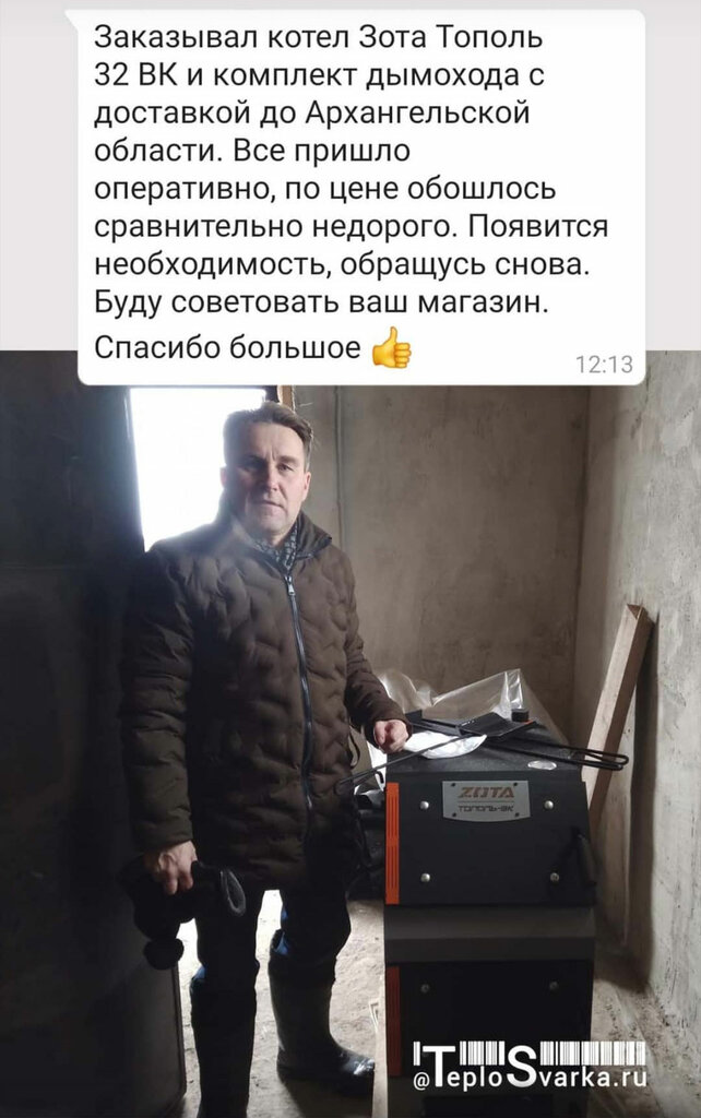 Оформил заказ на дровяной котел Купер 16, мне сразу перезвонили, были вопросы по дымоходу, мне скинули ссылку, на сайте очень удобно можно выбрать комплект дымохода полностью по дому наглядно и на фото. Я переоформил заказ и добавил дымоход. Все привезли на следующий день. Огромная благодарность водителю Александру, помогал заносить дымоход и котел в дом, ни копейки не попросил а делал это с интузиазмом и от души. Спасибо руководству за такую организацию продаж. Успехов вам, так держать.