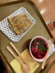 Очень приятная девушка на кассе и вообще персонал очень дружелюбный, а вот суп-лапша просто ужас! Бульонный кубик перемешанный с чем-то, может раст.масло, но куриным бульоном там и не пахнет, лапша жесткая, есть это невозможно, выбросила. Рис вполне съедобный, буженина жестковата, но съедобная. Хотя порция на ребёнка. По факту 600 р за мисочку риса с маленьким кусочком мяса, за эти деньги можно было наесться в другом месте. Блины не пробовала, не знаю, но обед так себе, прямо скажем.