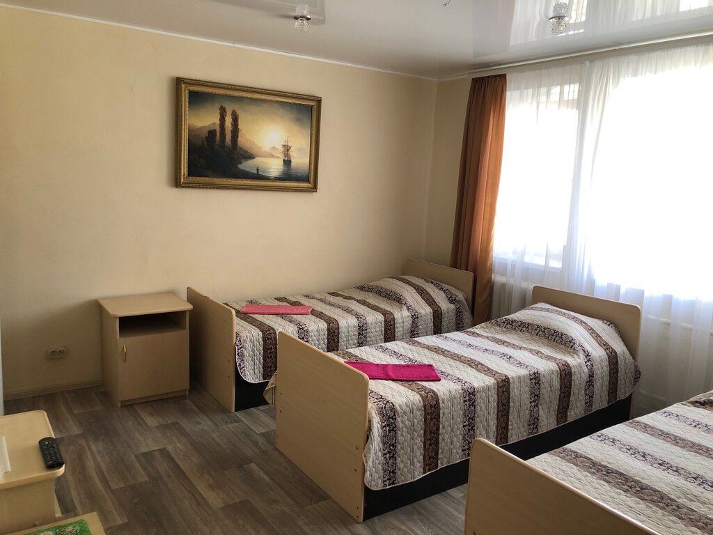 Гостиница за 900 рублей за ночь. Никаких излишеств в виде электронных чеков и удобств. Точнее удобства в коридоре. Пользуются этой гаванью юные боксеры с тренером и такие же горемыки. Для боксеров номер на 6 коек с телеком. Для тренера номер чуть больше платяного шкафа и тоже с телевизором чуть больше планшета. В холле, да простят меня за это название, разболтанный электрочайник, бутылки с водопроводной водой и еле живой холодильник. Вообще-то даже прикольно, для любителей погружения в историю СССР.