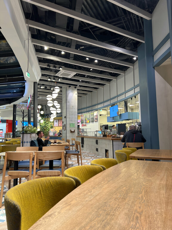 Расположен в ТЦ Мега Дыбенко около выхода в парк. Рядом расположен туалет, где можно вымыть руки. Через панорамные окна приятно смотреть на фонтан. Большое светлое помещение, чистый зал, персонал убирает сразу за клиентом, большой выбор напитков и блюд, если торопитесь,то можно заказать через приложение и подойти когда заказ будет готов.Приятно ,что тарелки из керамики,но стаканы к сожалению пластиковые. Есть стульчики для малышей. Кормят вкусно, готовят быстро, доброжелательный персонал! Отличное место как для перекуса ,так и семейного обеда, особенно в жаркие дни, когда так не хочется готовить. Рекомендую это место с русской кухней!