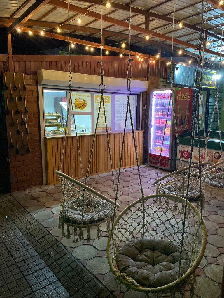 Отличное место. Есть качели, столики. Еда всегда вкусная и свежая. Видно что люди работают для клиента. Рядом фреш бар в котором большой выбор лимонада и кофе.