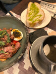 Атмосферное заведение, хорошее обслуживание, находится в центре Перми, много посетителей - пользуется популярностью. Но теперь о главном. Салат с тунцом был хорош, но можно поработать над выкладкой. Салат с баклажанами - дольки баклажанов слишком маленькие, чтобы почувствовать его вкус, но вот чего действительно много - это сыра в панировке. Результат - сырный салат с привкусом баклажанов. Выкладка хромает. Главное блюдо - говяжьи ребра. На вид блюдо нормальное, но что-то было с маринадом. Переперчили явно. Моя жена любит остренькое, но даже она не смогла есть. Сделали возврат. Пришёл человек с кухни, мило улыбнулся, сказал, что ребята переборщили с маринадом и передержали на гриле предложил исключить из счета и заменить на грудинку. Бифштекс взяли средней прожарки принесли полной прожарки, абсолютно сухой, как подошва, ни сока, ни вкуса. Сорри, не получился. Принесли грудинку - пересушили в шкафу, жёсткие волокна, внутри пленка, которую обычно удаляют. Десерт и чай - норм. Счёт в районе 3700 руб на двоих. Вечер не удался. Ощущение, что на кухне работают практиканты из кулинарного техникума. Это называется - головокружение от успехов, которое обычно приводит к скорому закрытию заведения. Мы с женой скорее всего не вернёмся сюда. Не хотим расстраиваться. Сорри, господа рестораторы. Все как на духу!