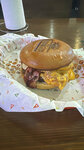 Бекон Аут Состоит из двух грильчизов - два подрумяненных тоста, между ними расплавленный сыр, а уже между двумя грильчизами две сочные котлеты из мраморной говядины прожарки МЕДИУМ, копченый бекон и сыр чеддер! +-550г - 1298₽