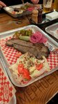 Томленая в течении практически 24 часов говяжья грудинка. Подаётся со свежим салатом, маринованными огурчиками и луком.