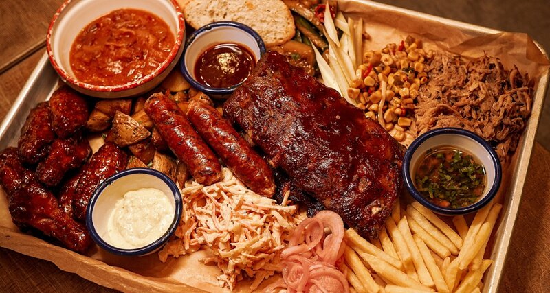Бельгийские вафли с соусом 1000 островов и Texas BBQ, говяжей грудинкой, жареным беконом, жареным яйцом, перцем халапеньо, маринованным луком и картофелем Пай