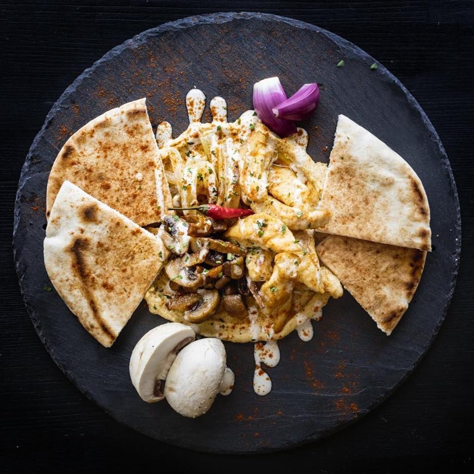 Обжаренная на гриле курочка с шампиньонами и репчатым луком. Подаётся на лаваше с хумусом, марокканскими соленьями (капуста, морковь, уксус, карри, куркума, кориандр), израильскими соленьями (два вида маринованной капусты, израильские маринованные ог