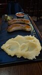 Колбаска из говядины и свиной грудинки, картофельное пюре с грибами, луком, сыром и беконом, айсберг, маринованный красный лук, соус на выбор