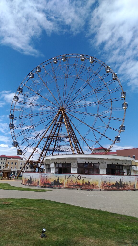 По порядку. Колесо расположено здорово 👍🏻. Вид с него замечательный 🔥 (фото прикладываю). На этом плюсы заканчиваются. По внешнему виду, бросается в глаза, что часть кабинок снято с колеса - 2 кабинки есть и одна пропущена и так по кругу. Сначала думал так задумано, но выглядит по дурацки. Потом понял, что в каждой кабинке установлен мобильный кондиционер - домашнего вида (как тумбочка). Цена за один билет какая-то нереальная! Кабинки оклеены какой-то дурацкой рекламой сока «Доьрый» которая лезет в каждый кадр (возьмите пример с Ярославля - тут колесо «Золотое кольцо России» и каждая кабинка оклеена тематически в честь городов золотого кольца России). Да и предусмотрен один круг - в других городах где мы были по 2 круга предусмотрено.