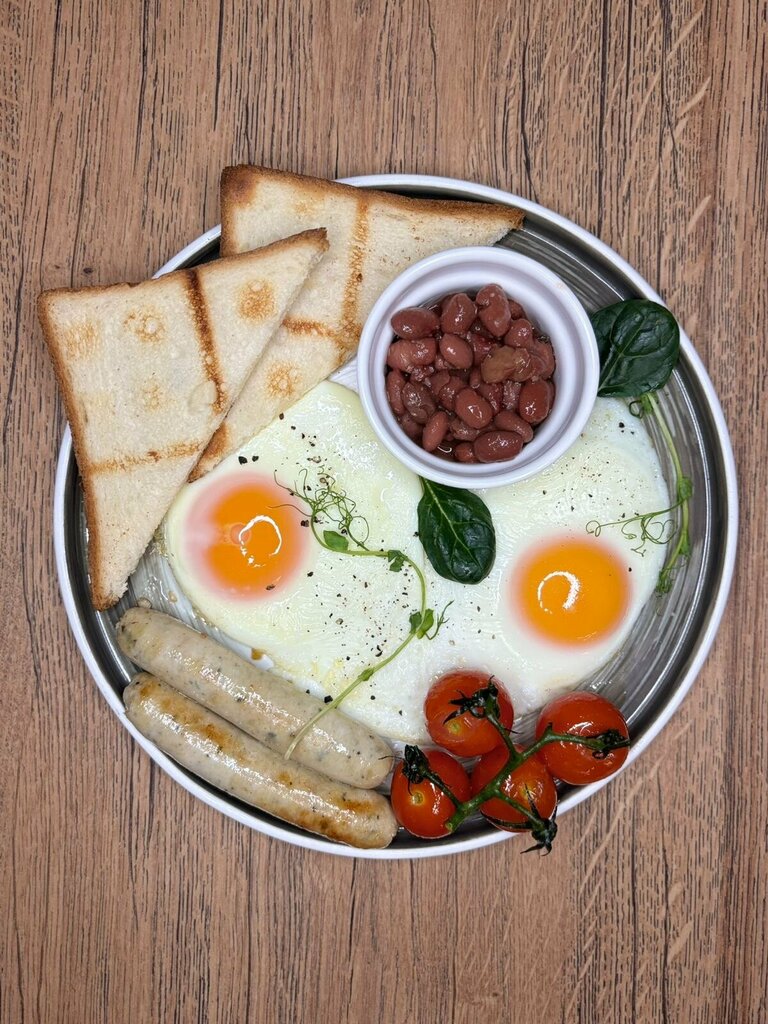 Английский завтрак - отличный выбор для начала дня! В составе этого сытного завтрака с яйцами: куриное яйцо, фасоль в томатном соусе, баварские колбаски, а также ароматный хлеб бриошь. Подаётся с овощами и микрозеленью