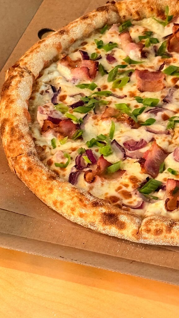 Сытная пицца с нежной ветчиной и ароматным беконом. Красный и зелёный лук добавляют сочность и лёгкую свежесть, а чесночный соус делает вкус ярким и запоминающимся.