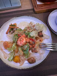 Добрый вечер! Сегодня днем зашли с подругой после прогулки перекусить. Выбор пал на зимнее предложение - теплый морской салат с юдзу и мандаринами. С первого взгляда, когда нам принесли салат, вид был, мягко говоря, «непрезентабельный», и по-вкусу тоже самое… Странный соус, которым была залита большая часть тарелки, видавший виды зеленый салат… Морепродукты ещё более-менее (только их и съели) Да и по фото в предложении салат выглядит совершенно иначе.