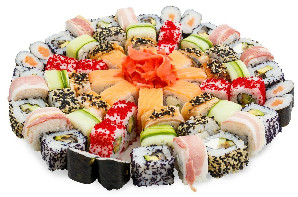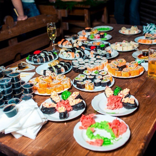 Variety of food:sushi and rolls, сhinese food