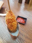 Решил попробовать Корн Дог Рамен. Не смотря на то, что меня спросили здесь ли я буду есть или с собой (ответ был "здесь"). Корн Дог дали в упаковке, без подноса и без салфеток. Чек об оплате не дали. Блюдо стоит 295 рублей. За эти деньги перед Вами корн дог с половиной сосиски и на 2-3 укуса начинки из сыра. На вкус не очень. Да и денег оно своих не стоит.