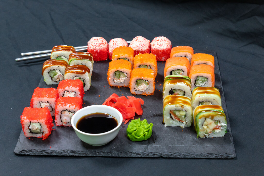 Variety of food:sushi and rolls, sweets, fixed meal