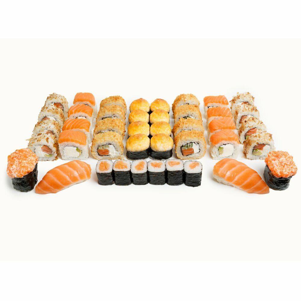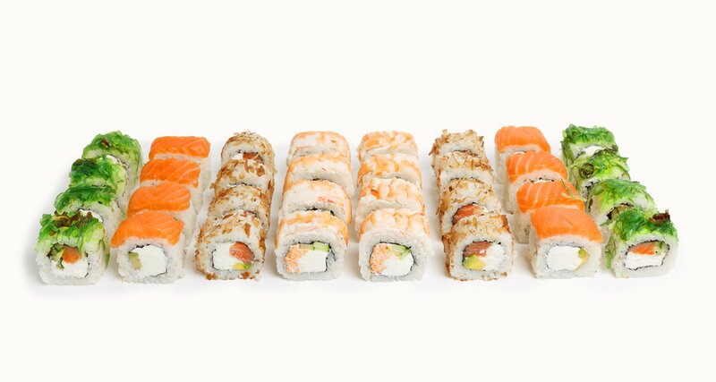 Филадельфия с лососем (4 шт.), Киото (8 шт.), Панко (8 шт.), Италия (4 шт.), Ролл с Омлетом и Филадельфией (6 шт.), Ролл со Снежным Крабом (6 шт.)