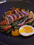 Тунец, картофель, микс салата, помидор, огурец, лук красный, фасоль стручковая, яйцо, заправка к салату, крем бальзамик, кунжут, лимон