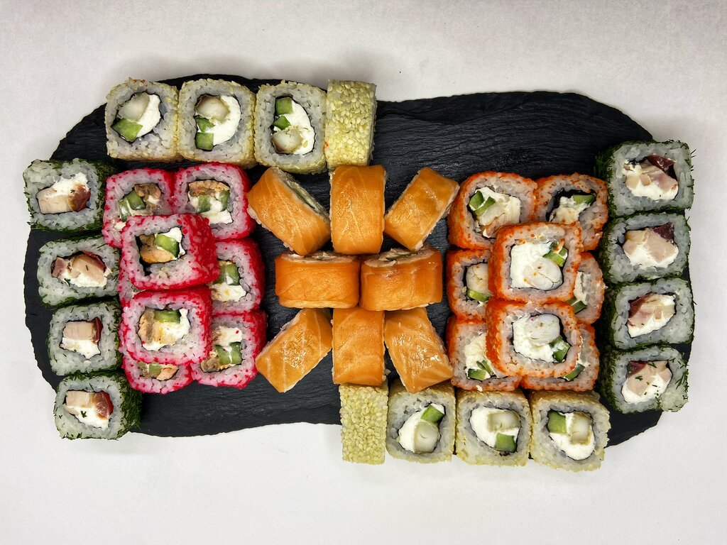 Variety of food:sushi and rolls, sweets, pizza, сhinese food