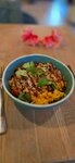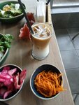 Все шикарно огромные порции . классический том я м шикарен сытный и вкусный . салат с карри и креветками великолепен , онигири как огромный ролл очень вкусный и холодное латте это очень вкусно . обстановка уютная чистая . цены как везде нормальные . хорошее место в центре города .