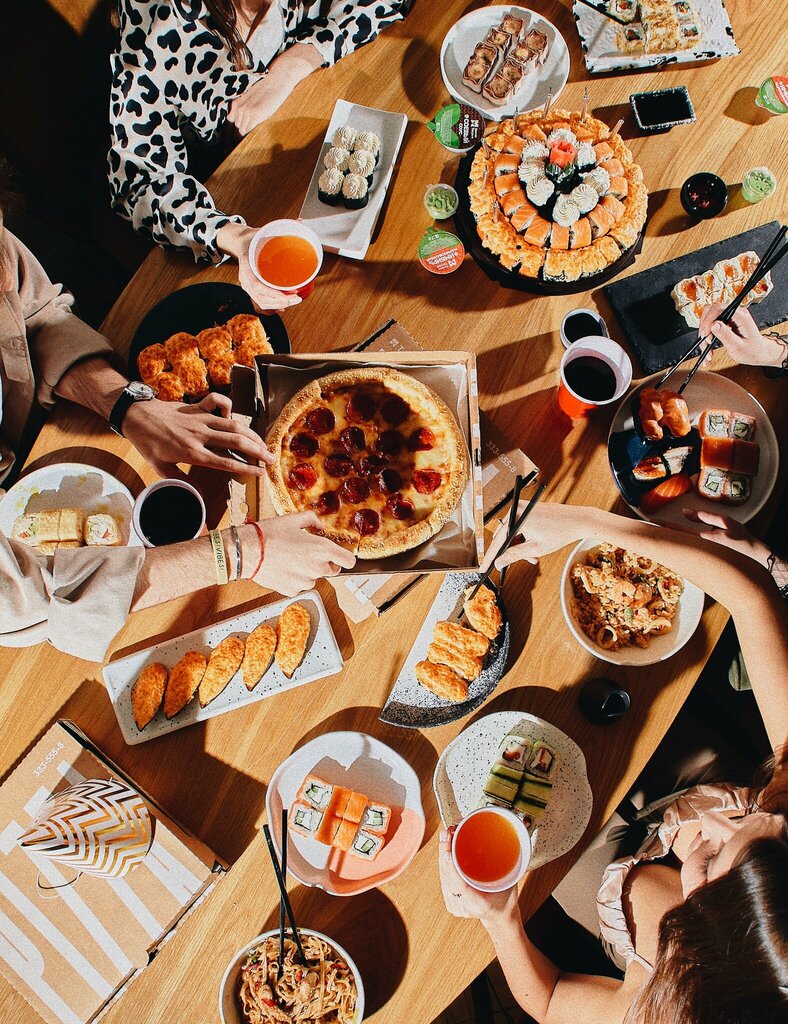 Variety of food:sushi and rolls, pizza, home cooking