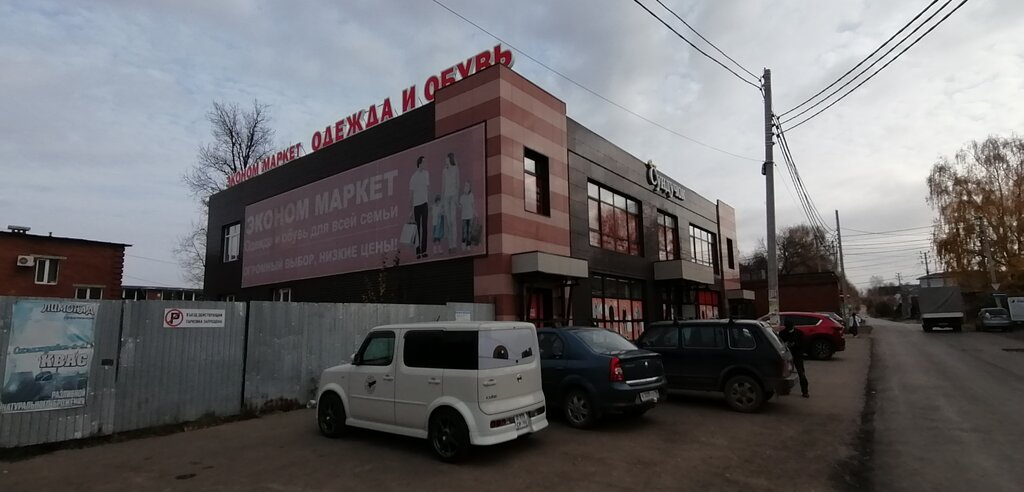 Большой магазин с одеждой по относительно низким ценам. Ассортимент товара разнообразный. Перед магазином парковка.