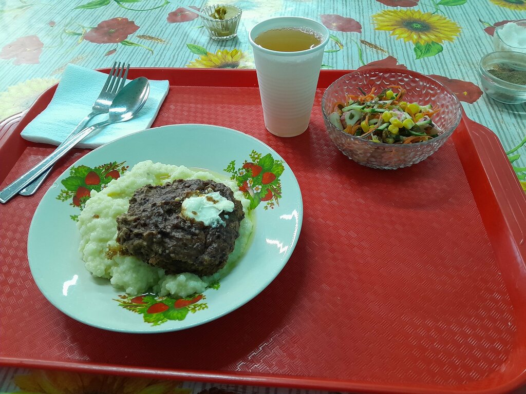 Столовая. Очень вкусно по демократичным ценам. Каша,котлета, компот,салат: 260р.. Шаньга творожная 40р. Туалета нет.