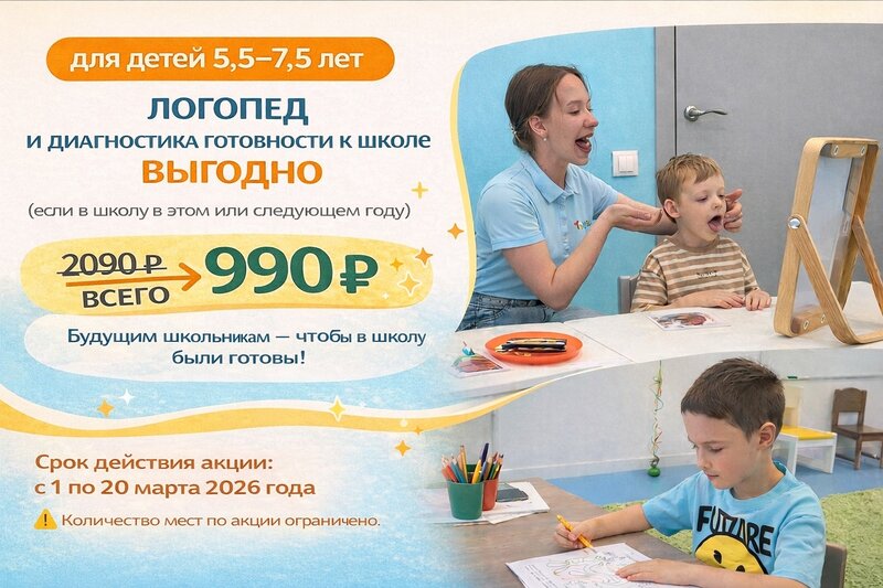Логопед + проверка готовности к школе — всё за 990 ₽! Ребёнку 5,5–7,5 лет — и вы думаете о школе? Неважно, идёт он в этом году или только ч...
