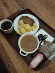 Хорошая трапезная, ценник приятный, еда простая. Всё, что на фото вышло на 710₽. Не понравились только щи и картошка - вся плавала в растительном масле. Приборы только пластиковые, есть шницель одной пластиковой вилкой без ножа - так себе удовольствие. А вот сбитень очень хорош, возвращалась за вторым стаканом. И милые вкусные пряные пряники в виде медвежат)