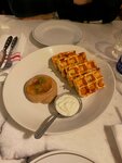 Пришли поужинать с супругом и сыном. Забронировали конечно столик за день. Сначала атмосфера была очень шумной но потом привыкли. Взрослые заказали судака с лисичками и по салату с ростбифам, вафли с начинкой из скумбрии, а сын салат цезарь с хрустящей курицей и медальон и картошку фри. Все остались очень довольны едой, атмосферой и конечно сервисом! Все на высшем уровне. Место в которое хочется вернуться. ❤️