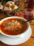 Большие порции, вкусно. Обед на трех человек, первое, второе, десерт 2400. Отлично! К чаю травяному вкуснейшему подали три вида меда. Летние беседки в полисаднике красивом. Муж заказывал сковородку с мясом единственно не доел, большая очень. Смело можно на двоих. Мне понравилась котлета с пюре. Первое все вкусно. Официантка приветливая, предлагала долить кипятка в чайник . Но он и так был огромный. В общем советую. В дороге болел у меня живот, после чая с медом все прошло)))