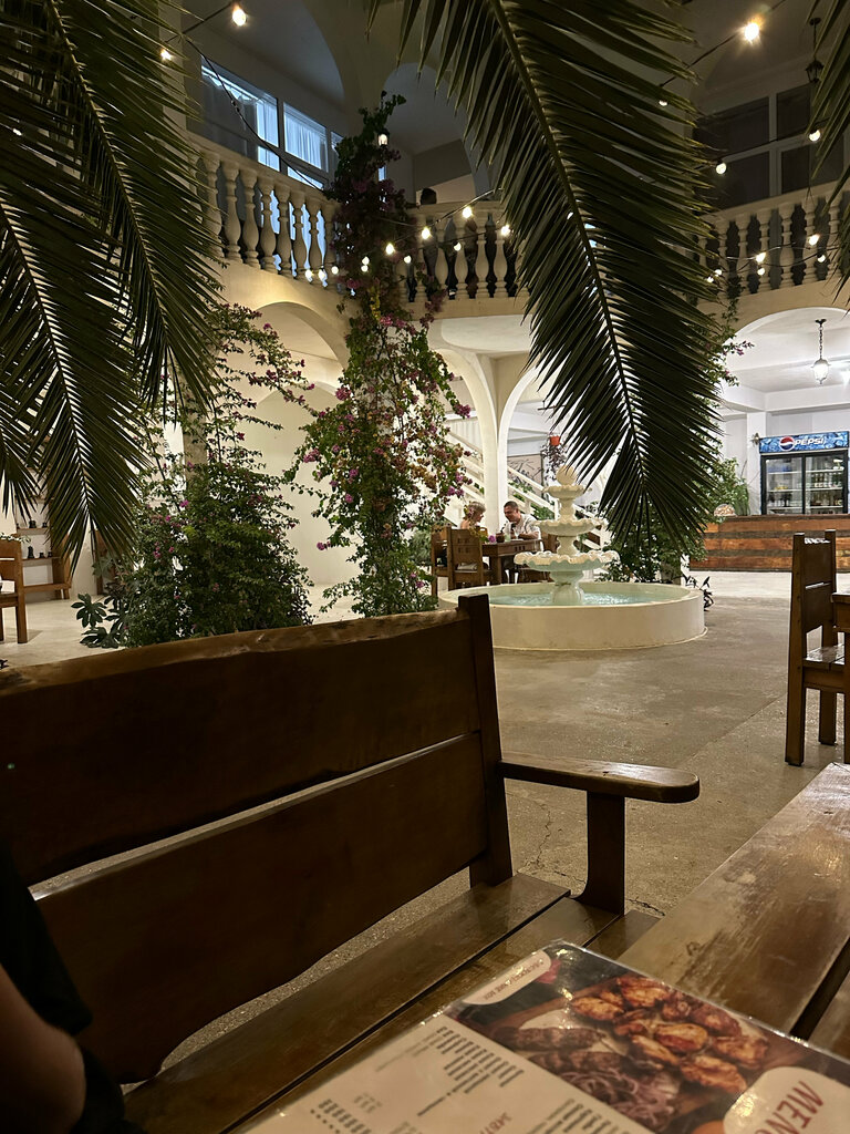 The most delicious khachapuri, the most delicious cuisine in the area. We started with this cafe upon arrival, went through a lot of places and returned here. An outdoor cafe with a fountain, two entrances, palm trees and live music. A shady courtyard full of vegetation, heavy wooden furniture. The interior is well thought out.