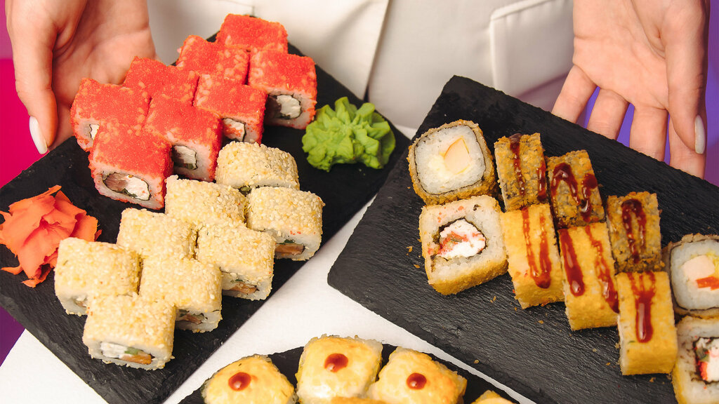 Variety of food:sushi and rolls, сhinese food