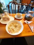 Приятная обстановка, уютно. Паста Карбонара. Сливочная, приятный вкус свежего молотого перца, спагетти альденте; бекон хороший, без постороннего привкуса. Очень понравилась. Меренговый рулет. Корж крайне плотный, липнет к зубам, не позволяет есть рулет, не давя его; малина свежая, вкус насыщенный ; крем воздушный, лëгкий; меренга хорошая. Просто вкусно. Молочный улун. Понравился.