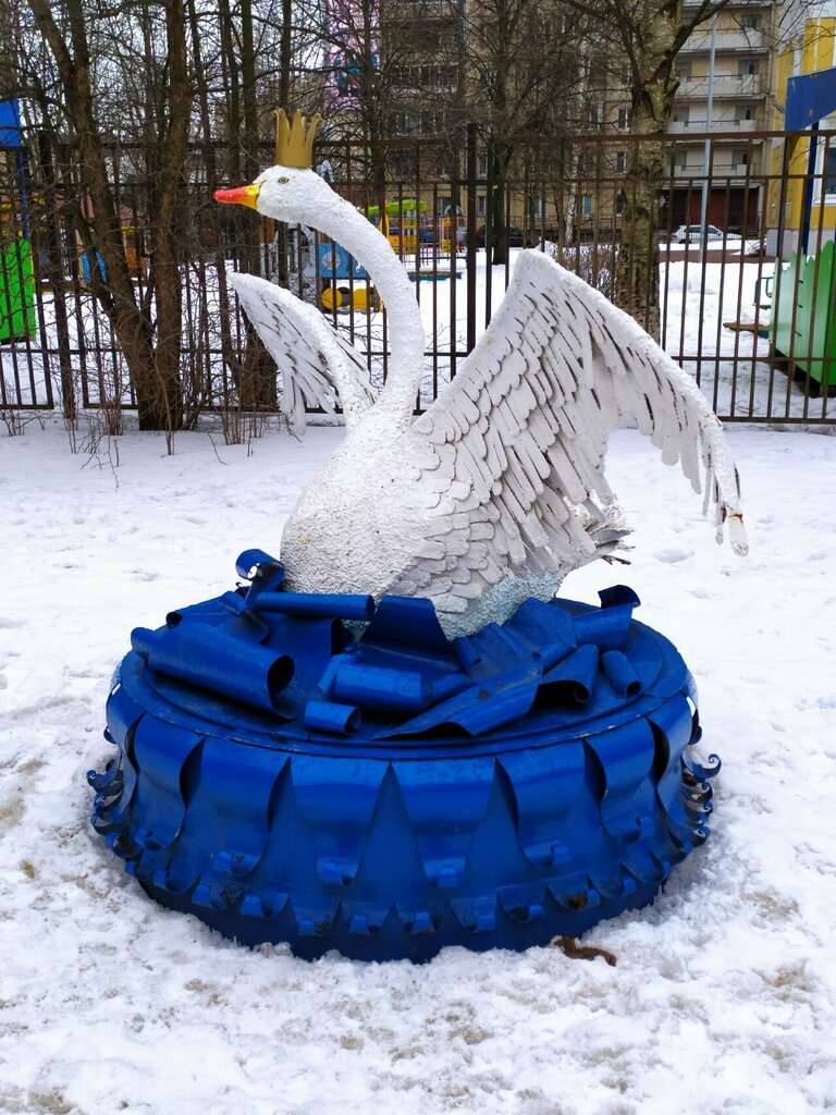 Кажется что лебедь очередное произведение шино-утилизационного мастерства. Но нет. Материалы прочные, ухоженность ярко выраженная. Просто сделана "под ЖЭК-арт". Приятно встретить что-то сказочное среди серых будней.