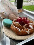 Хрустящий круассан с миндальным кремом и ягодами малины. Сладко-ягодный дуэт, который делает любой перекус маленьким удовольствием.