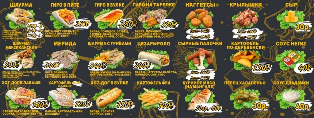 Ломтики сочного мяса, обжаренного на углях, румяная фри собственного приготовления, солёный огурец, помидорка, капусточка, фирменный соус и тонкий лаваш, поджаренный на гриле. Халяль.