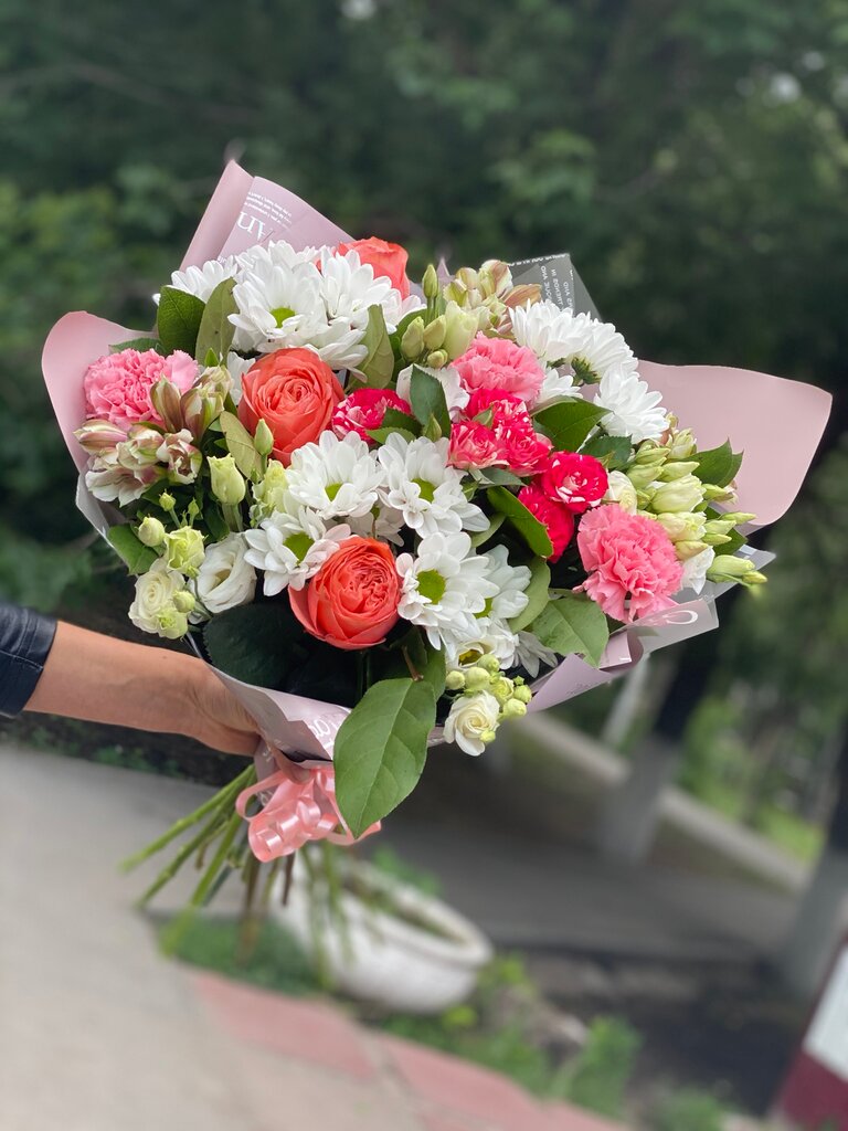 Хорошие букеты, есть и шарики, и открытки, очень удобно, что не нужно бегать по магазинам. Цены чуть выше среднего.