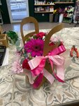 Гербера-1шт Диантус-4шт Альстромерия-1шт Хризантема кустовая-1шт Сантини-1шт Зелень микс Подарочная сумочка Лента. Ширина-170мм Высота-250мм В случае замены цветка, мы максимально стараемся сохранить цветовую гамму композиции.