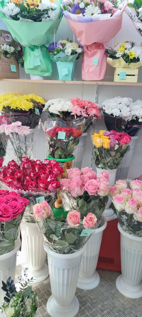 An original flower shop. The assortment is average. The flowers are fresh and bright. Beautifully packaged. Convenient location. Affordable prices. They accept the card. Parking on different sides. I recommend this shop. There are also a lot of seeds on sale.