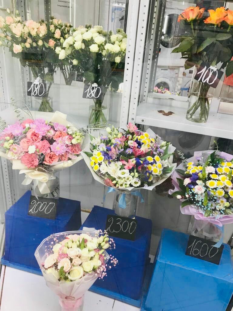 Помимо цветов, ещё можно заказать сладкие вкусняхи к букету))) прикольно,только заказывать заранее нужно.Букеты собирают очень красивые, цветок долго стоит.