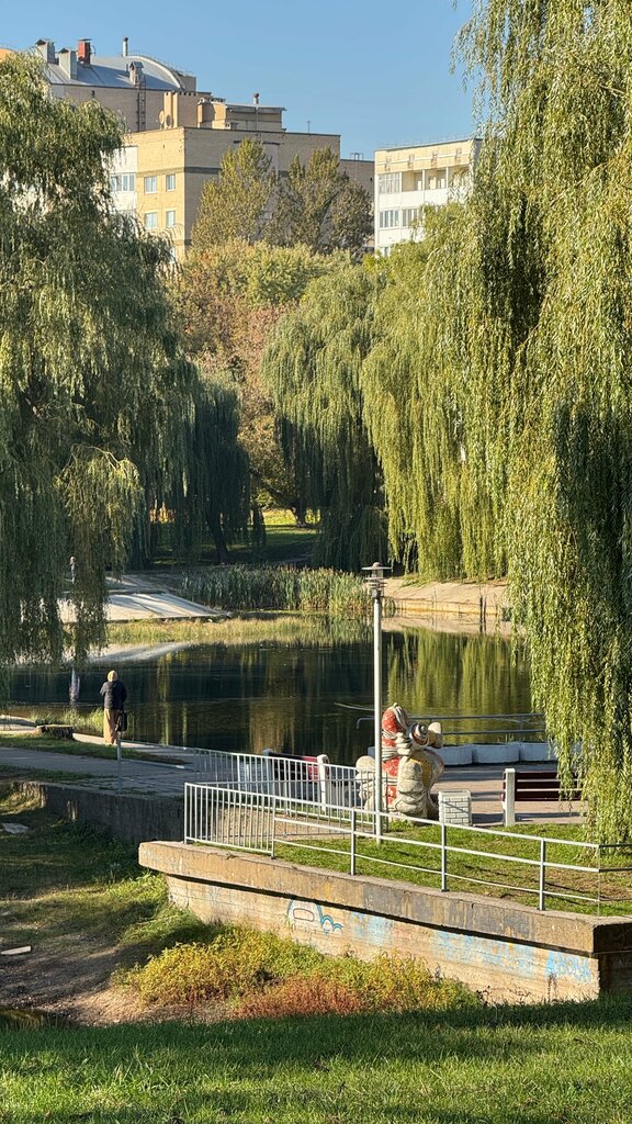 A quiet, cozy place to take a walk. A spacious park where people walk either with dogs or with strollers. Sometimes someone sleeps on a bench or is already trying to barely get home. You can sunbathe or feed a flock of ducks. All that's missing is a food truck with hot dogs and coffee.