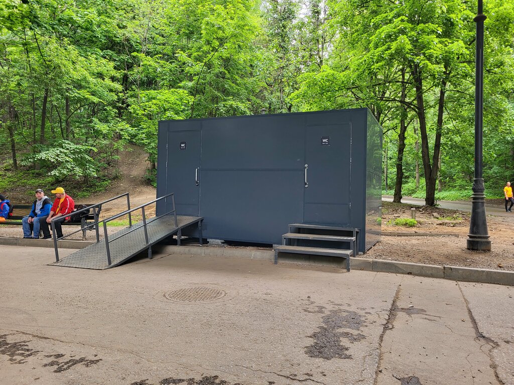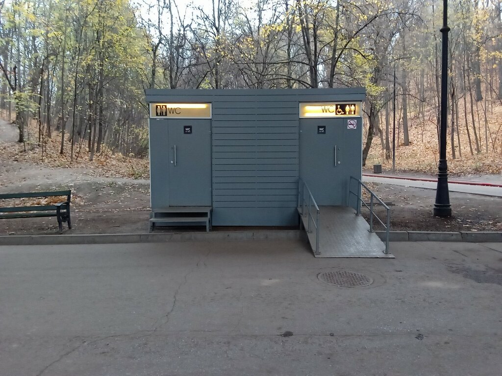 Туалет две кабинки бесплатно. Не синие кабинки. После прогулки по Воробьёвы горам или набережным лучше место.