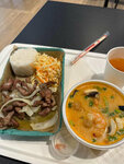 Это было слишком хорошо! Обед выше всех похвал. Возьмите и не пожалеете. У меня здесь суп с морепродуктами (похож на рамен том ям), свинина в каком-то очень вкусном соусе и лимонад. Все это добро стоило 650, я сыт и доволен. Спасибо!