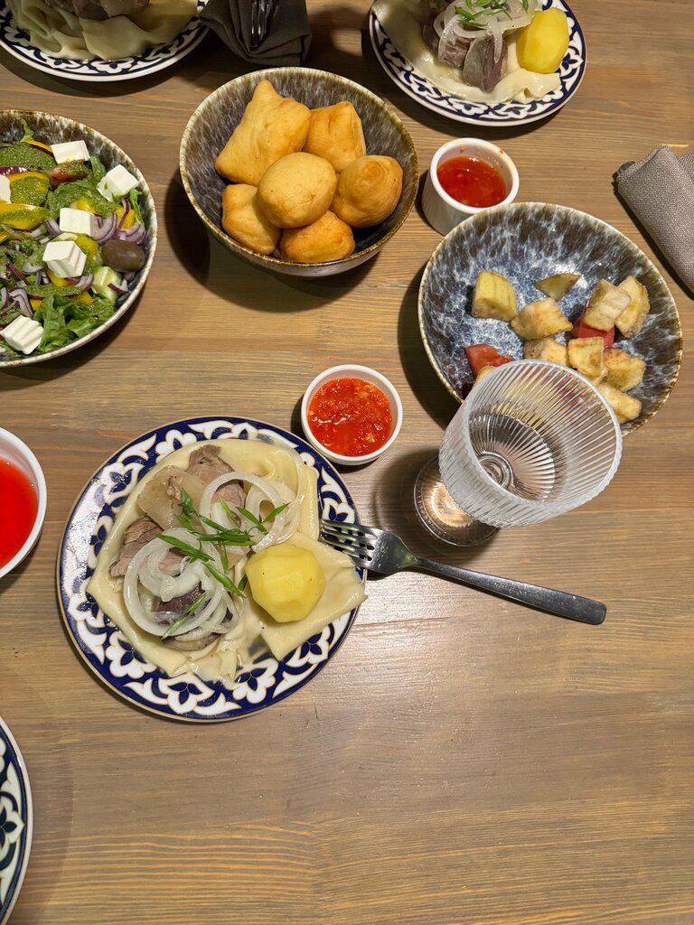 Nice kitchen, cozy place. But the unjustified price for admission is 1000 tenge, which is charged even from children, despite the fact that a maximum of half an hour of the singer's performance sounded, which was torn between the summer concert and the hall. A high percentage for primitive maintenance. In a lower-level establishment, our plates were replaced, and here we ate like piglets for 5 hours from dirty. They couldn't wait for their plates for the cake, which they ordered from them, the tea had already cooled by this time.