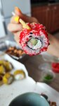 Суши топ!!! Большие, вкусные, свежие. И очень быстро. В основном заказывают на вынос и доставку. Но есть маленький зал с 3 столиками: уютно, нарядно, чисто. Готовят очень быстро. Продуктов не жалеют.