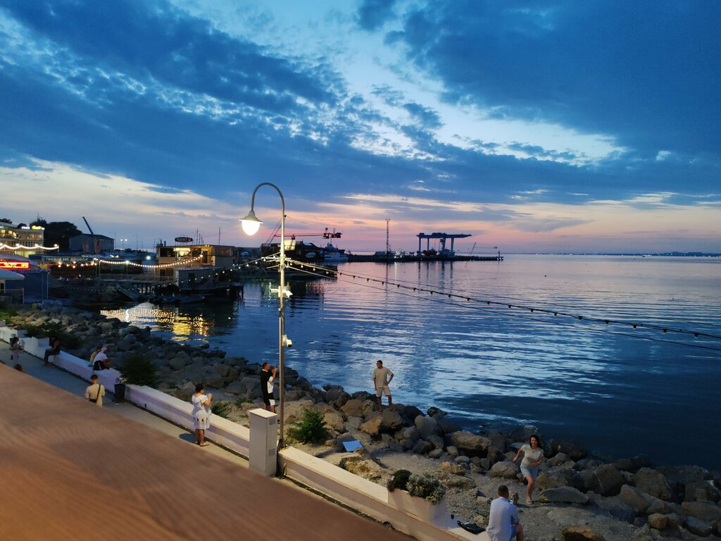 Здесь хороший песчанный берег. Всё чисто. Чуть вглубь пляжа пройдёшь здесь есть кафе и столовые. Разливное пиво и мороженное. Есть мусоросборники. Много развекательных аттракционов для детей. Заход в море плавный. Долго нужно идти в глубь моря чтоб вода стала хотя бы по пояс. Но есть огромный минус: здесь всегда тина. В самой воде она плавает мелкими кусочками зелёными, а на берег её прибивает чёрной гнилостой массой похожей на нефть. Гниющая тина воняет отвратительно. Нужно всё время искать место где тины поменьше. А в остальном здесь очень красиво.