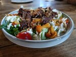 Куриное филе, перец болгарский, баклажан, цуккини, соус огненный, томат черри, лук маринованный, тортилья пшеничная
