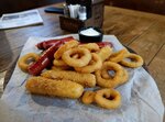 Крылья куриные баффало, ребрышки пикантные, сырный брусочек, колбаски куриные, колбаски охотничьи, гренки бородинские, картофельные дольки, кетчуп, горчица французская, тар-тар, зелень