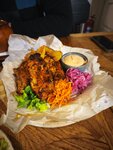 Свиные рёбра. картофель. лук маринованный .морковь пряная, салат микс. соус пикантный.