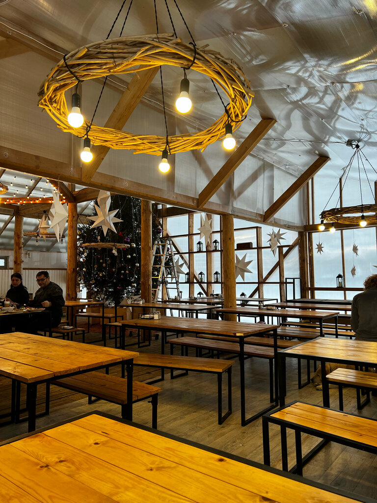 Цены ресторанные, но само заведение - это обычная кафешка. К сожалению, в окрестности больше сходить некуда. 1) Атмосфера и интерьер придорожного кафе. Мы были в октябре, в помещении холодно, руки помыть можно только на улице холодной водой, в туалет сходить тоже на улице. 2) Само меню вроде как разнообразное, заказали тыквенный суп, борщ и 2 бургера, аж, по 990 рублей каждый), но никаких булочек бриошь не увидели)) и все остальное очень посредственное и обычное. Очевидно, цены очень завышены. Если вы очень голодные, сходить можно, не могу сказать, что было не вкусно. Но если есть возможность поехать куда-то в другое место, то лучше что-то поискать.